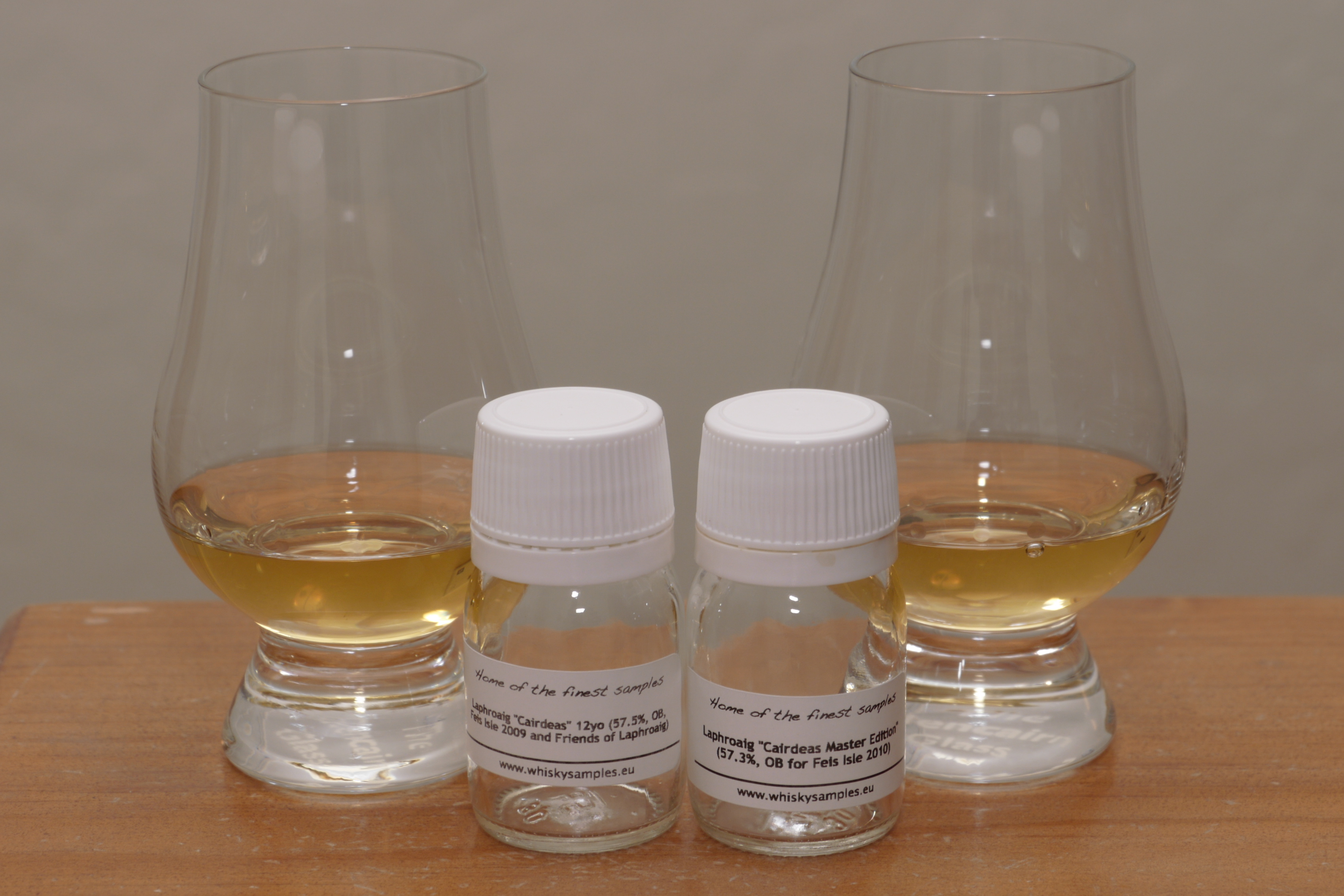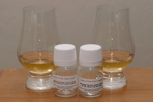 Last year, after following Feis Ile vicariously through other blog posts, I ordered some festival samples, including the Laphroaig Cairdeas [car-chase] 2009 release, which I did a post on here . I went to do the same this year for the 2010 release, and discovered that whiskysamples.eu had a few extra samples of the 2009 Cairdeas in stock as well, so I ordered both. I decided to compare both of the Cairdeas cask strength releases with the standard Laphroaig 10 CS Batch 001 release to see how they stacked up.