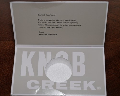 Knob Creek has apparently closed out their Drought of 2009 marketing campaign, and they’ve done it in style. A bunch of Stillhouse members have reported receiving a package in the mail with a commemorative barrel bung to celebrate the resumption of Knob Creek bourbon bottling. I just got mine today.