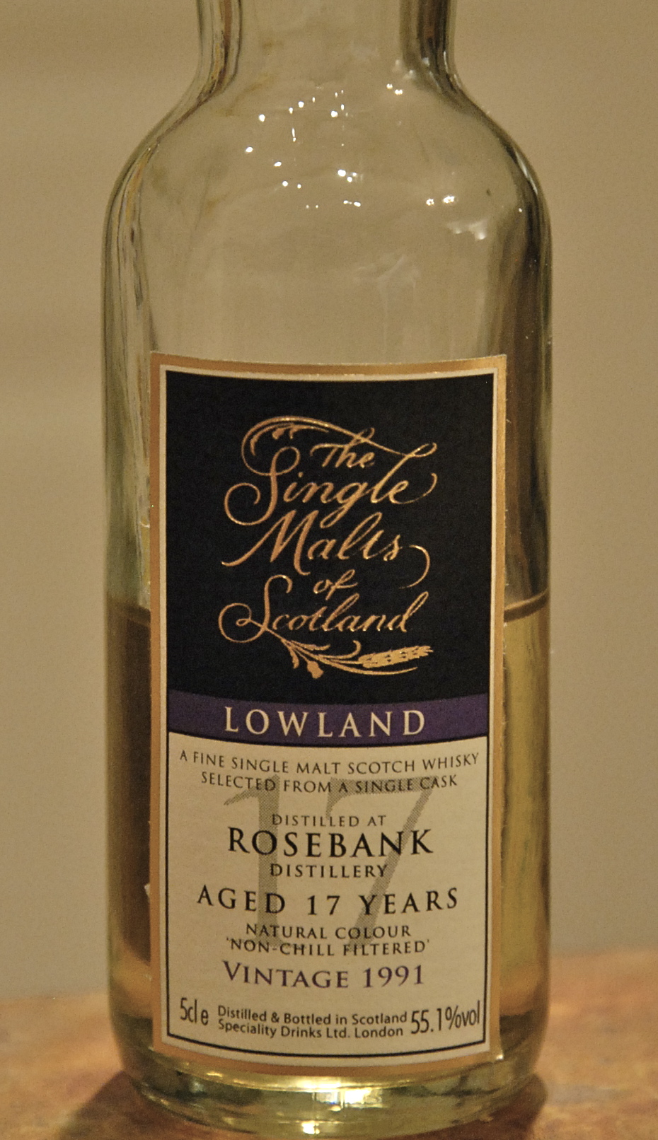 Of the closed distilleries in Scotland, Rosebank, a lowland distillery, doesn’t have quite the buzz of a Brora or Port Ellen. There does, however, seem to be a fairly widespread opinion in the whisky community that it’s a shame Rosebank isn’t still in operation. Fortunately for us, they appear to have had a pretty good stock on hand when they closed. A “Rosebank” search on The Whisky Exchange web site currently turns up 18 results, with 10 expressions from various bottlers available for under $100. The focus of this post is a 50 ml sample of Rosebank 17 year, 1991 vintage, bottled at 55.1% ABV from The Single Malts of Scotland (Specialty Drinks Ltd.), a sister company of The Whisky Exchange. This particular expression is non-chill filtered and has no additional coloring added, and it’s bottled from a single cask.