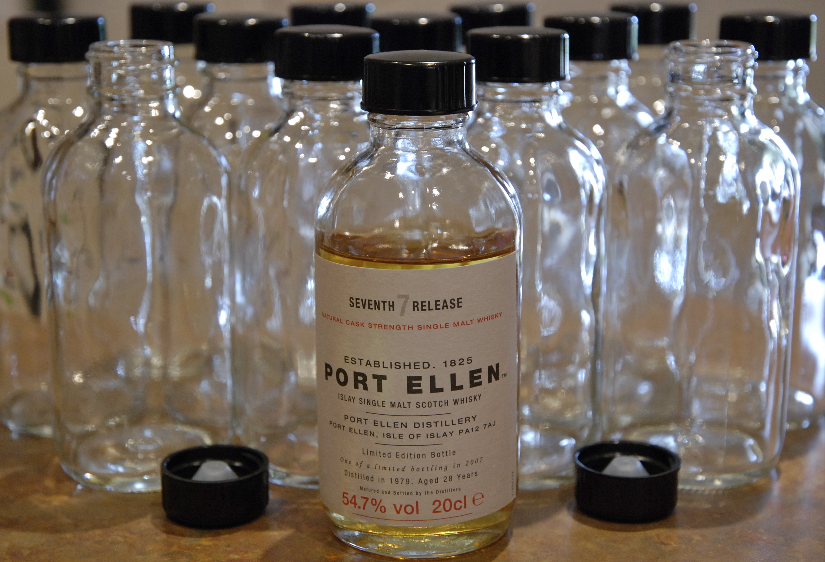 I used the first bottle to save 10cl of my Port Ellen 7th release (from a 20cl original bottle). I suppose I could have just kept it in the 20cl bottle, but I wanted to play it safe and cut down on the amount of air in the bottle (and seal it up tight). For the label, I used the original from the 20cl bottle. I put about an inch of water in a pot and brought it to a boil, stuck a screwdriver in the empty bottle and held onto the handle, and dangled the bottle over the steam for about 2 minutes. The label peeled right off, and had enough of the glue on it still to just stick it right on the boston round bottle.